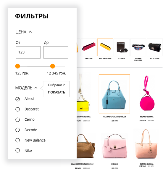 За допомогою спеціальних фільтрів користувач здійснює пошук продуктів і їх сортування за такими параметрами, як назва, вартість, наявність на складах, торгова марка, знижка.